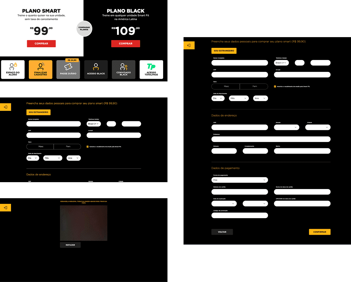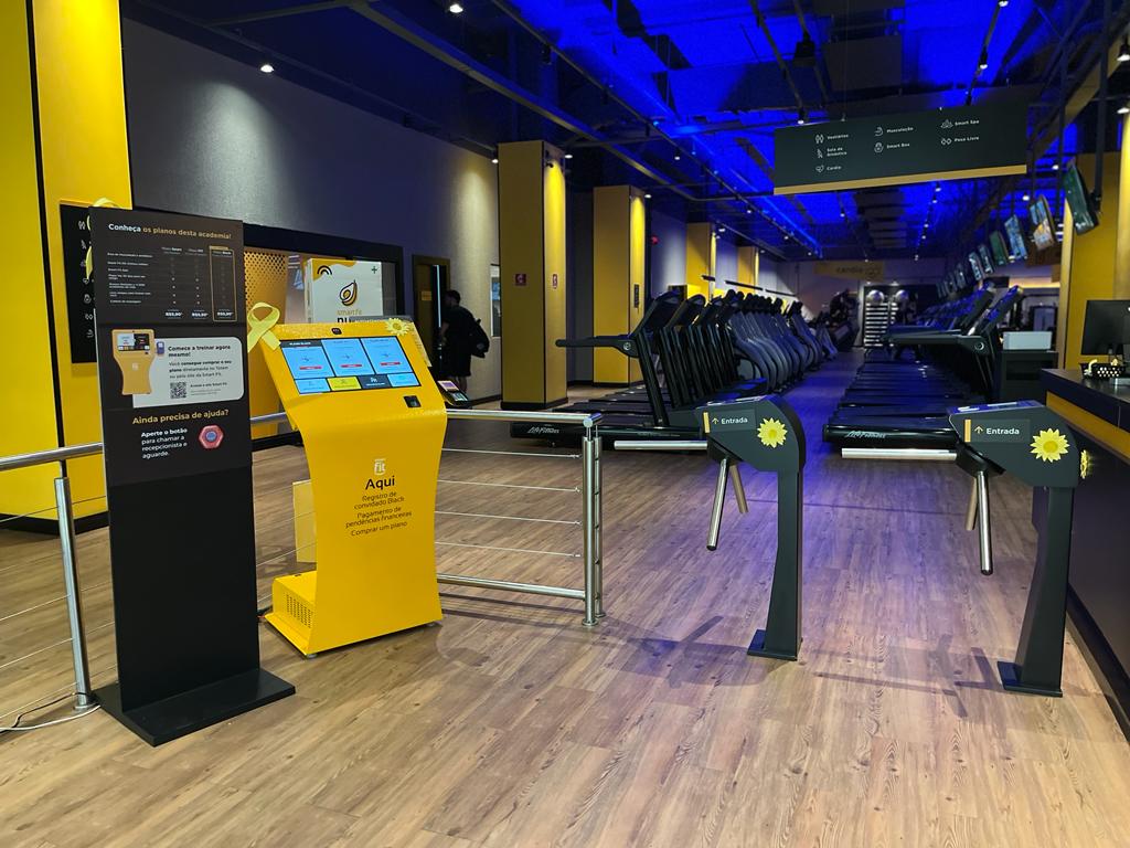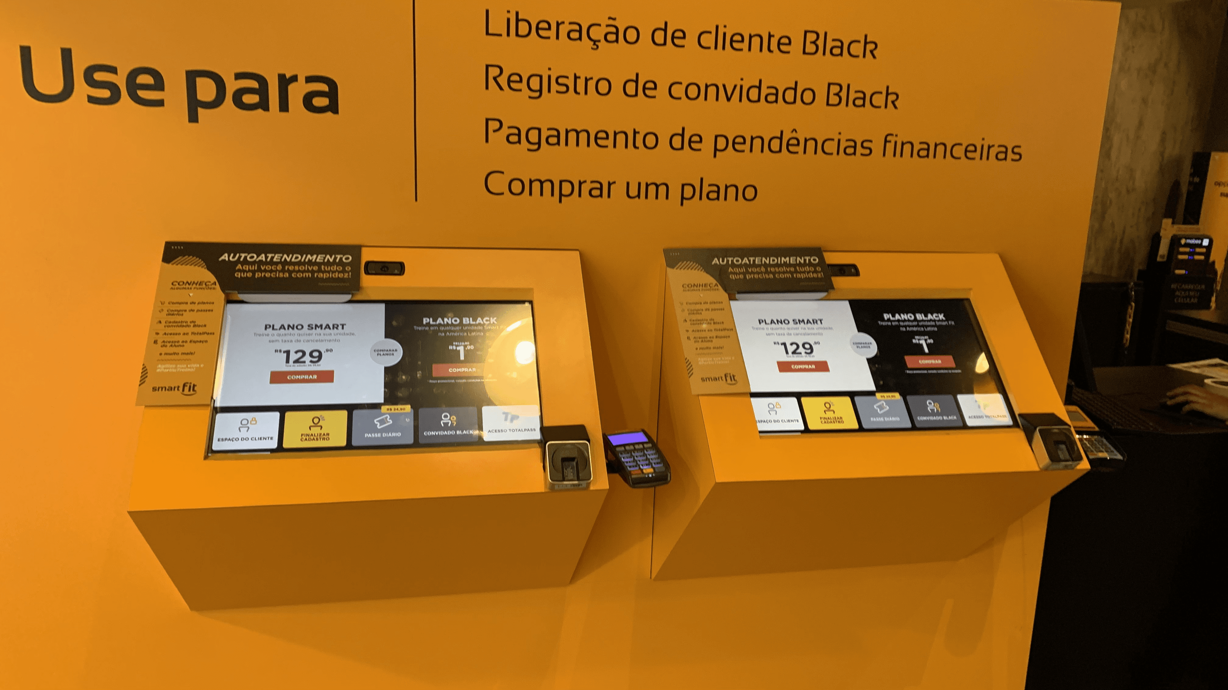 Junto com o time pesquisa da Smart Fit realizamos um benchmarking com totens de autoatendimento em diferentes contextos, como condomínios, mercados autônomos e academias, para compreender como outros produtos lidam com desafios semelhantes aos nossos, como: